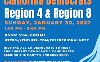 All CA Democrats are welcome! ???? Please RSVP now for our next virtual joint CDP Region 4 & Region 8 Meeting here: https://tinyurl.com/2022RegionalMeet Meet the Candidates seeking the state party’s support. For information … Continue reading CDP Region 8 Quarterly Meeting Sun. Jan 30 1-3 p.m.